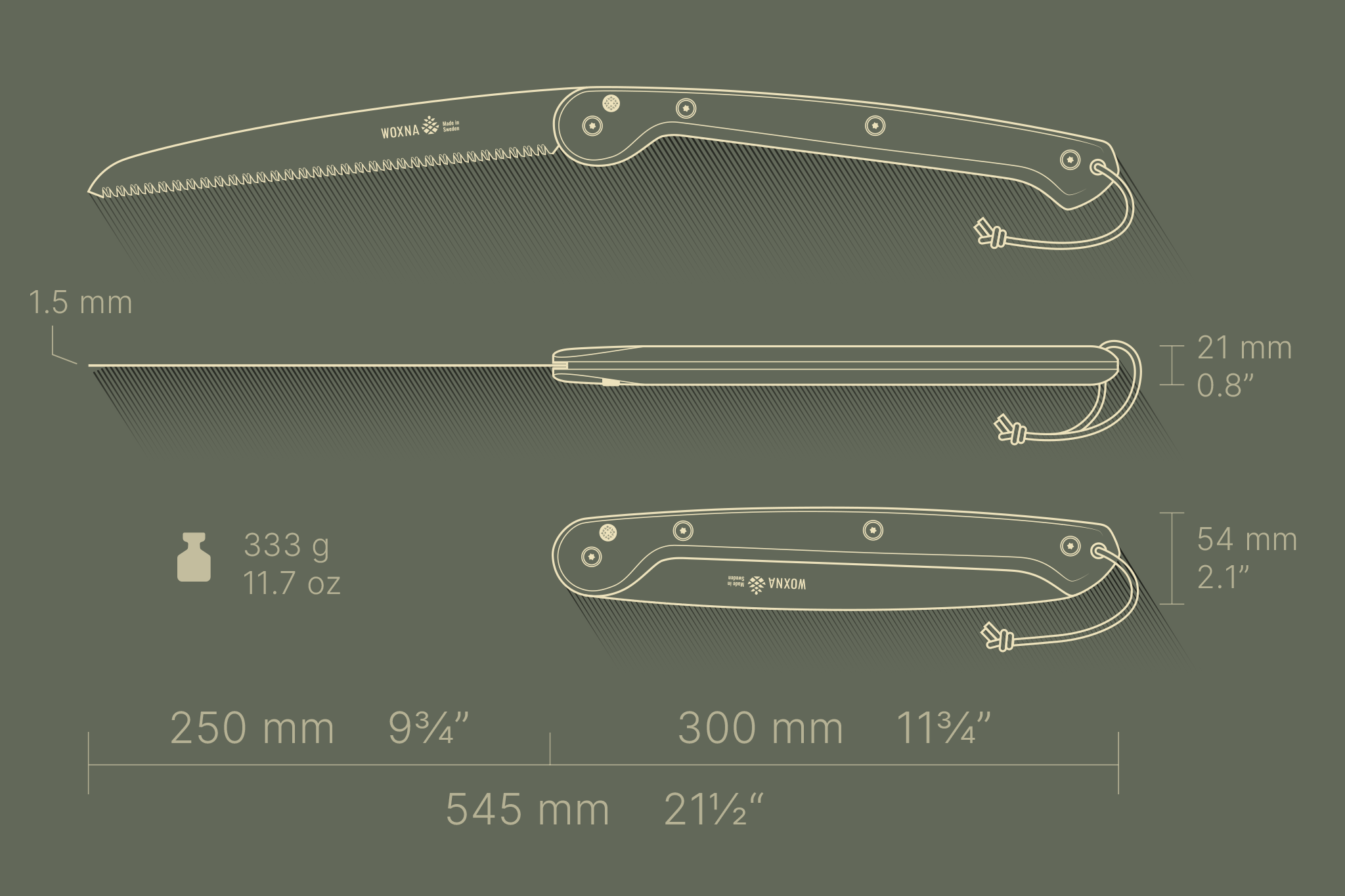 För handtagen har vi valt amerikansk valnöt eftersom det är ett hårt trä, men ändå ett naturligt material. Vi behandlar den endast med linolja för att bevara den naturliga känslan, tveka inte att applicera mer vid behov. Sågen kan demonteras helt om det behövs för rengöring eller underhåll. Inga specialverktyg krävs för att öppna sågen, endast två torxs T25 skruvmejslar. Tänk på att träet kan expandera och dra ihop sig på grund av förändringar i fuktighet, och detta kan påverka delarna så vi inte demonterar sågen, så vi rekommenderar att du inte demonterar sågen. det är nödvändigt. Om du demonterar sågen, se till att sätta ihop den igen direkt efteråt.